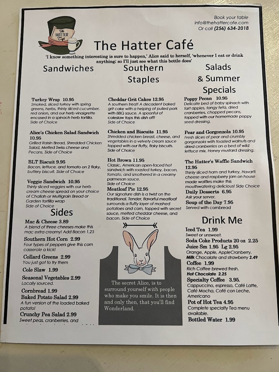 For lunch, indulge in the Cheddar Grit Cakes paired with savory pulled pork and tangy Memphis coleslaw, or savor the innovative Meatloaf Pie, a comforting twist on tradition with cheesy goodness and a crispy bacon topping. The vibrant and inviting atmosphere, reminiscent of Alice in Wonderland, enhances the culinary experience, making it a must-visit. With a diverse selection of freshly brewed teas and charming decor, the cafe offers an unforgettable adventure for the senses!