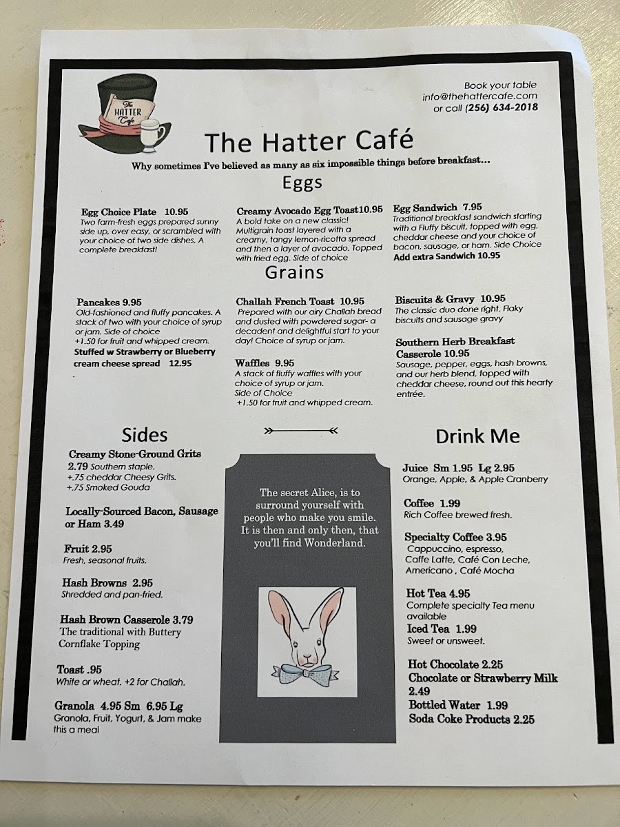 Welcome to The Hatter Cafe, a whimsical dining gem nestled in Mentone, Alabama. Here, every dish tells a story and every bite is an adventure! The menu boasts delightful breakfast offerings like the Creamy Avocado Egg Toast, featuring multigrain bread topped with a zesty lemon-ricotta spread and a perfectly fried egg, and Challah French Toast, decadently sweetened with honey and orange zest.